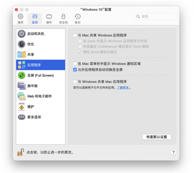 6、共享应用程序也会占用Mac的内存,特别是当你同时运行多个虚拟机时。如果这些应用在虚拟机里用得不多,我建议关闭共享功能,这样可以省点硬件资源。