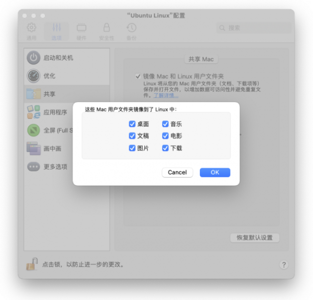 3、打开Parallels Desktop的控制中心,点击Linux虚拟机旁边的齿轮按钮,打开选项设置页面。在新弹出的窗口中,点击“选项”页面中的“共享”一栏,勾选“镜像Mac和Linux用户文件夹”以及“与Linux共享自定义Mac文件夹”两项。